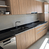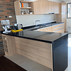 Mobiliario de cocina estructurada en Melamina 18mm de color Maple Grava con cubierta de cuarzo negro diseñada a medida.